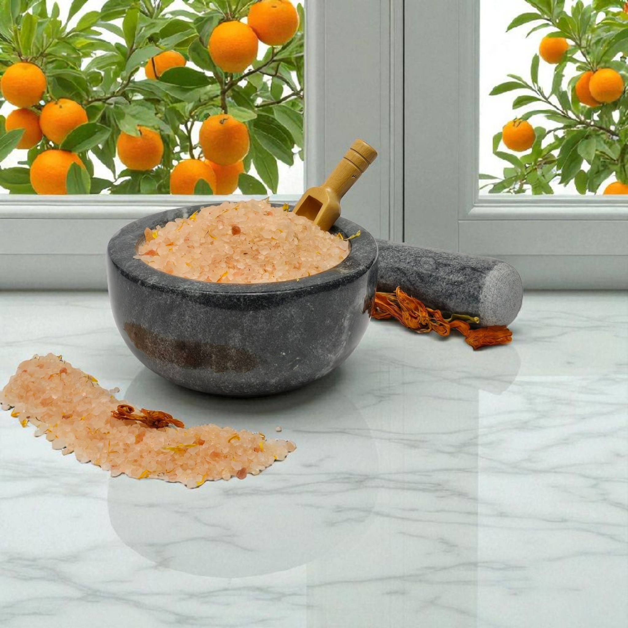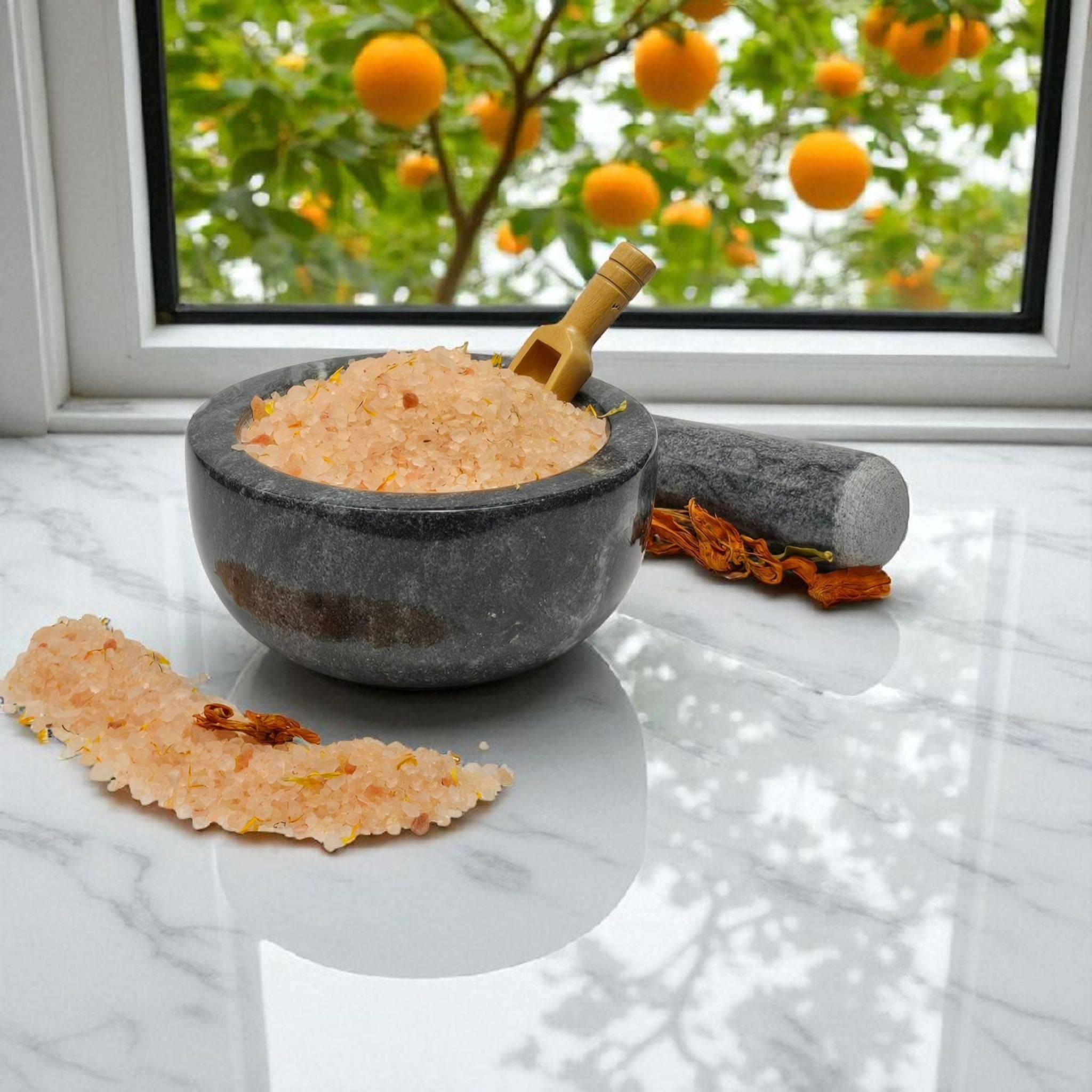 Brighten your mood with sweet orange and Citrus Bliss-infused Himalayan salts, featuring DoTerra oils and vibrant dried flowers.